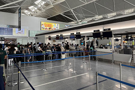 ラーメンを食べた後は、ラウンジに移動して、持参したiPadでYouTubeを見て過ごし、14時にチェックインカウンターに行くと長蛇の列になっていた。