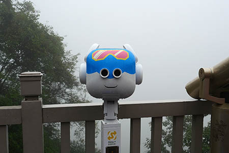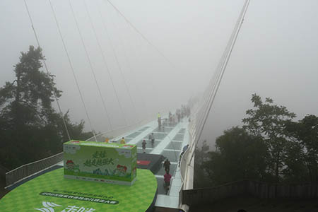 ガラス橋なのに、足元も真っ白で見えない。向こう側まで行き、一度外に出て、ガラス橋の全景が見られるポイントまで行くも、もちろん何も見えない。