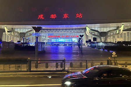車窓。高速道路の出入口。 車窓。ホテルからすぐの成都東駅。