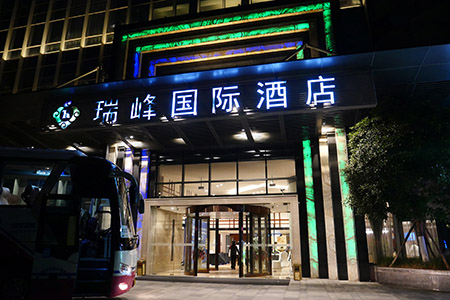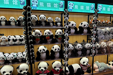 ホテルの入口。 ホテルの売店。旅行中にパンダのぬいぐるみは買ったが、ここでは買わなかった。