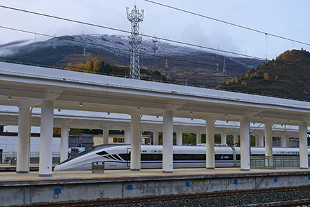 乗ってきた高速鉄道。 別のホームに別の高速鉄道。背景に雪山。