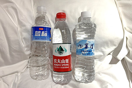朝食。とにかく目玉焼きに塩が欲しい。 今回の水。ホテルにもあるし、バスでももらえた。