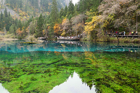 五花海手前の池。むっちゃ綺麗だが、滞在時間数十秒。 五花海。むっちゃ綺麗だが、駆け足で回る。