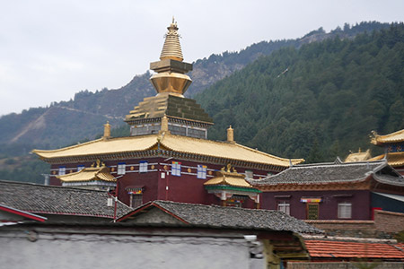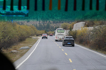 | 追い越し。普通に対向車が来ている。 | 車窓。金ピカの寺院。 |