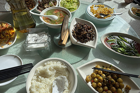 11時。少し早めの昼食。郷土料理とのことだったが、卵とトマトの炒め物をはじめ、とても無難な料理だった。